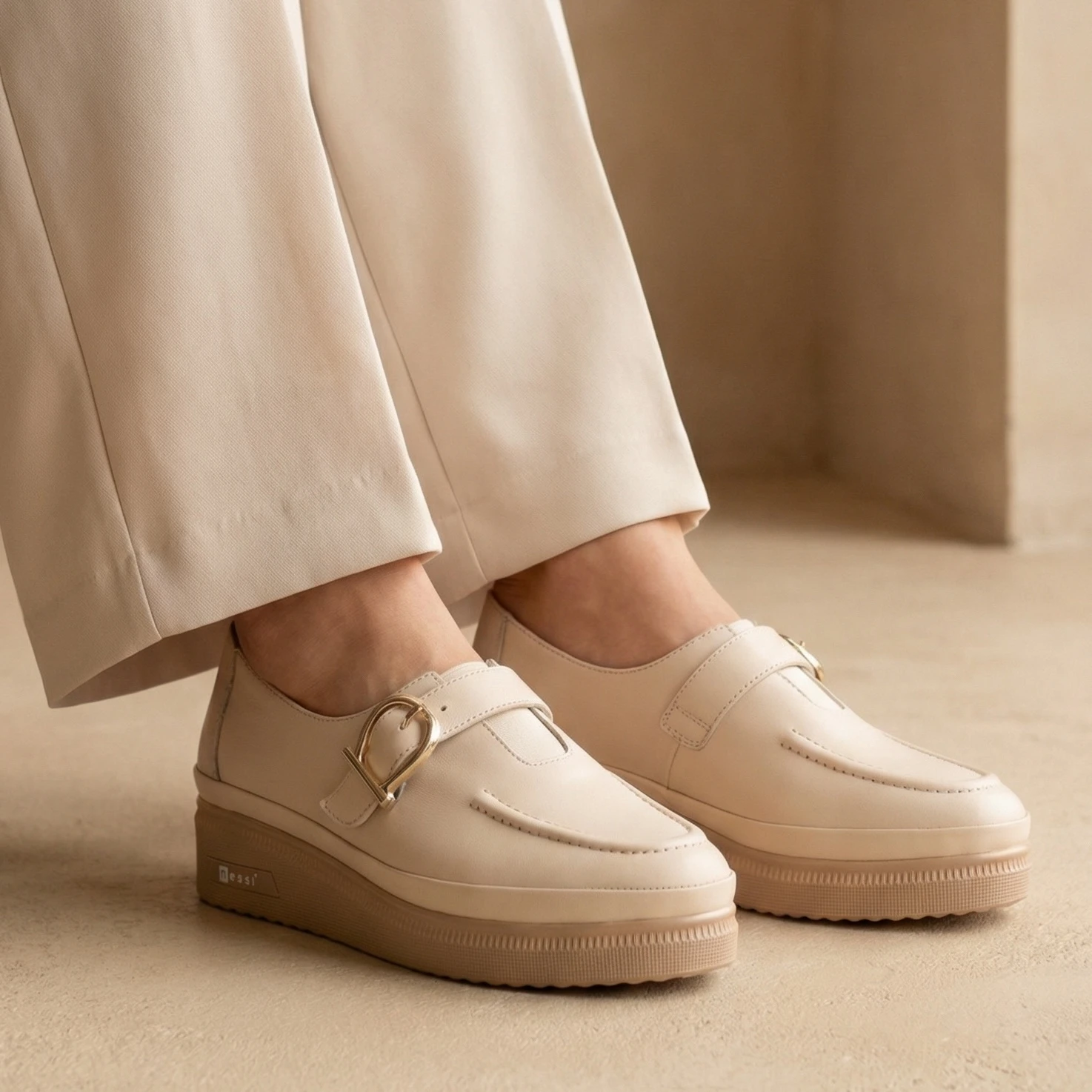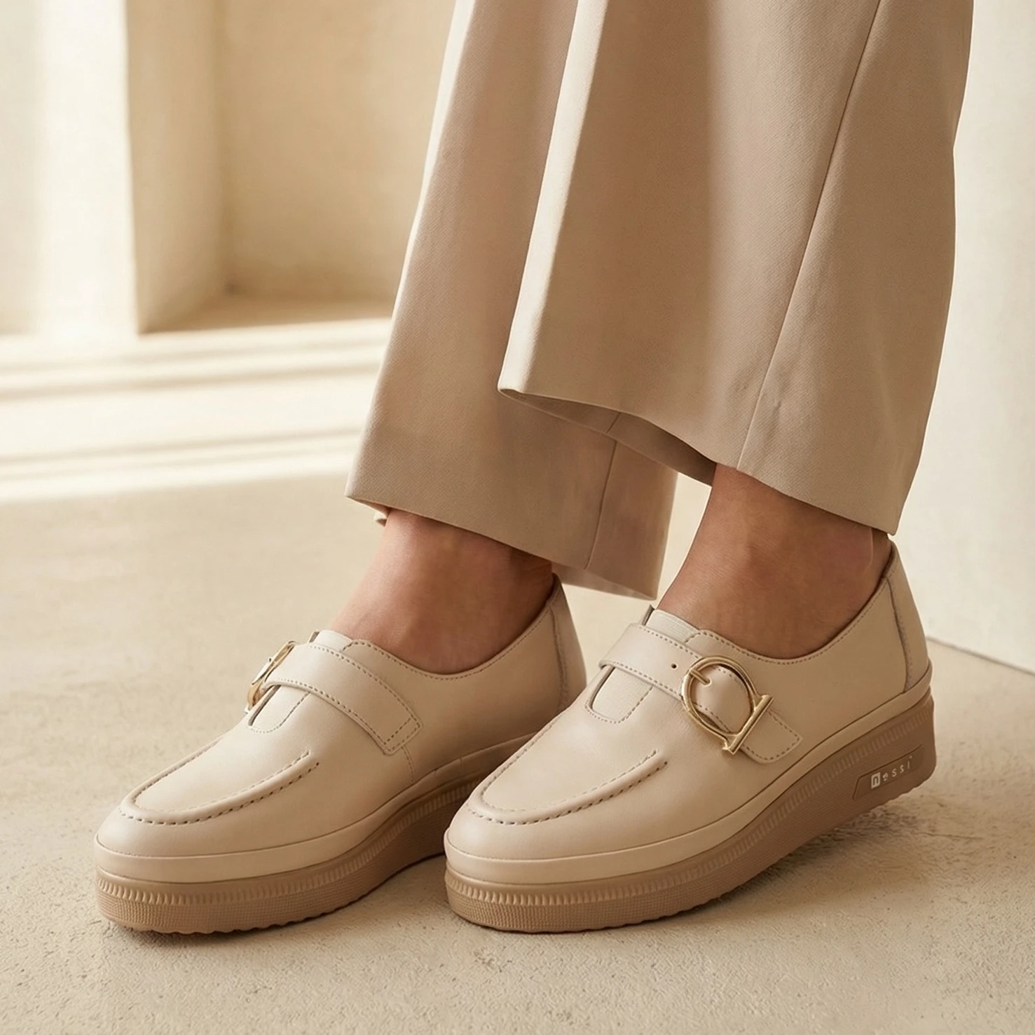 Beżowe półbuty damskie wykonane z naturalnej skóry licowej to połączenie wygody i elegancji. Model wsuwany z ozdobnym paskiem i złotą klamrą nadaje całości subtelnie stylowy charakter.