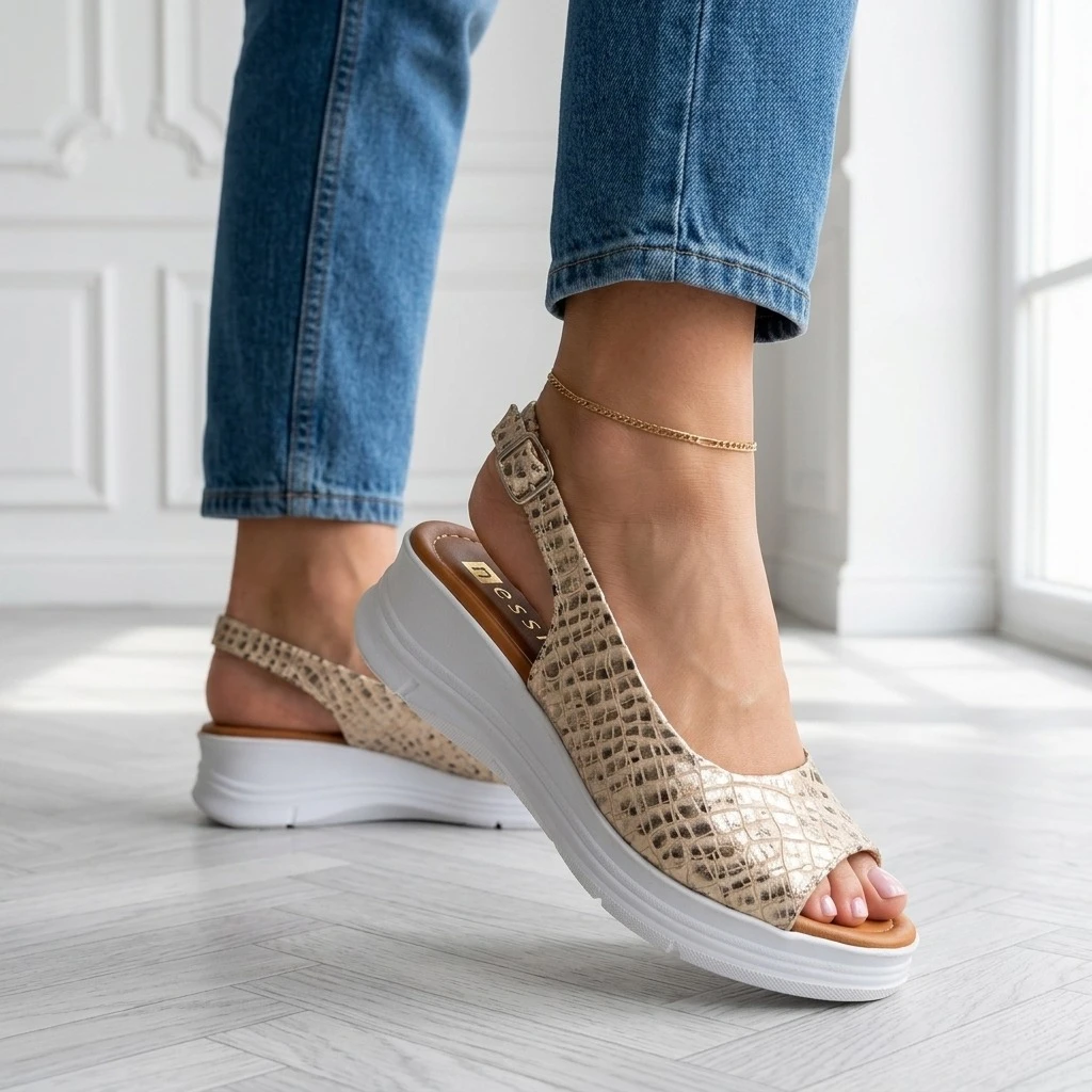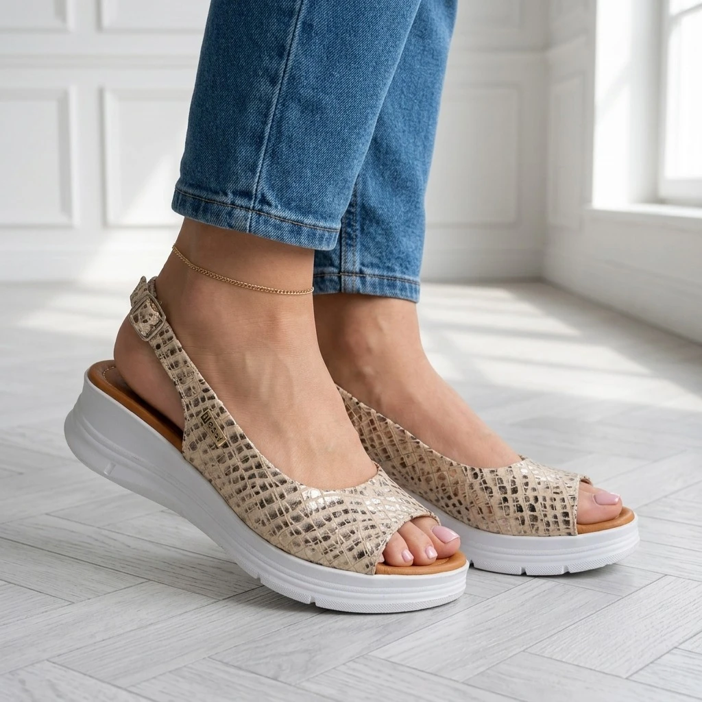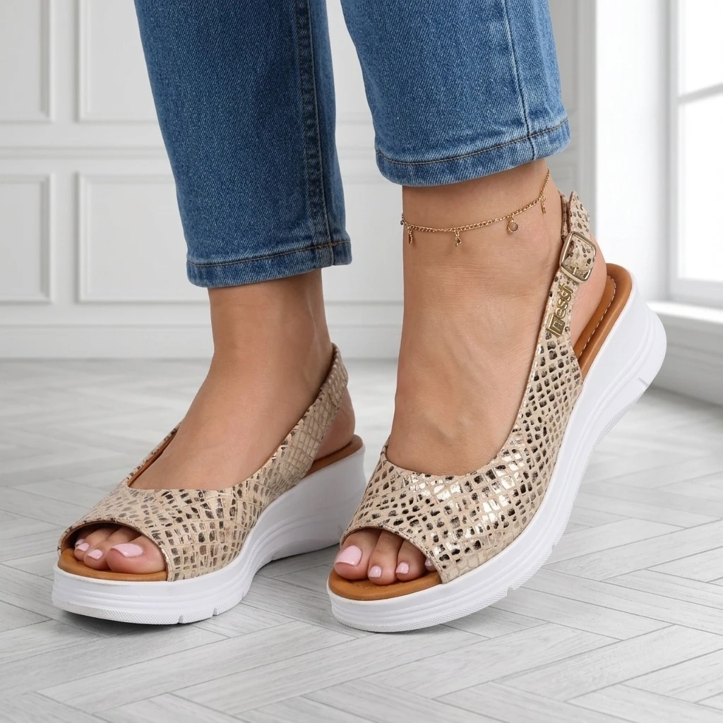 Sandały 26LS104 to Beżowa skóra z wzorem węża w złoto-bronzowej tonacji, wygodny koturno na platformie. Wygodna platforma, slingback ze sprzączką i miękka wkładka sprawiają, że są komfortowe od pierwszego założenia. Koturno subtelnie unosi sylwetkę, dodając pewności siebie.