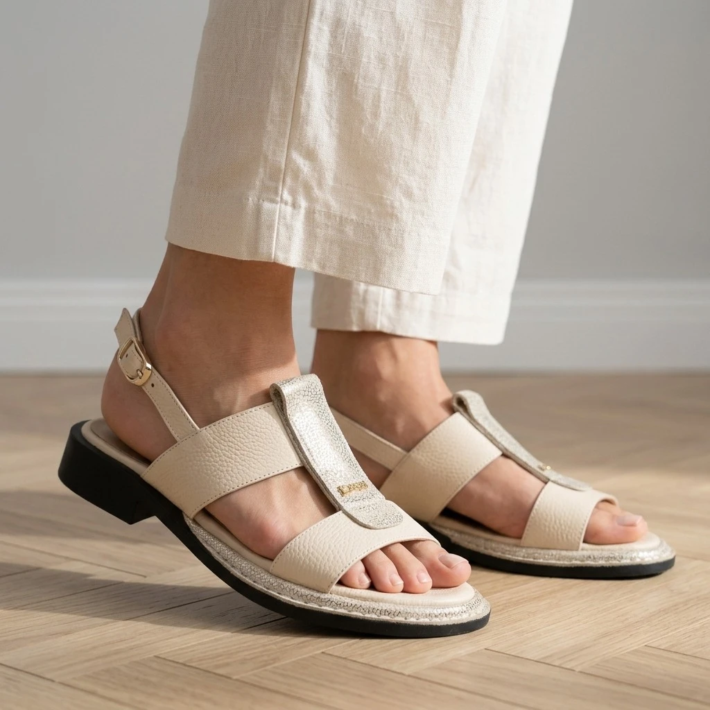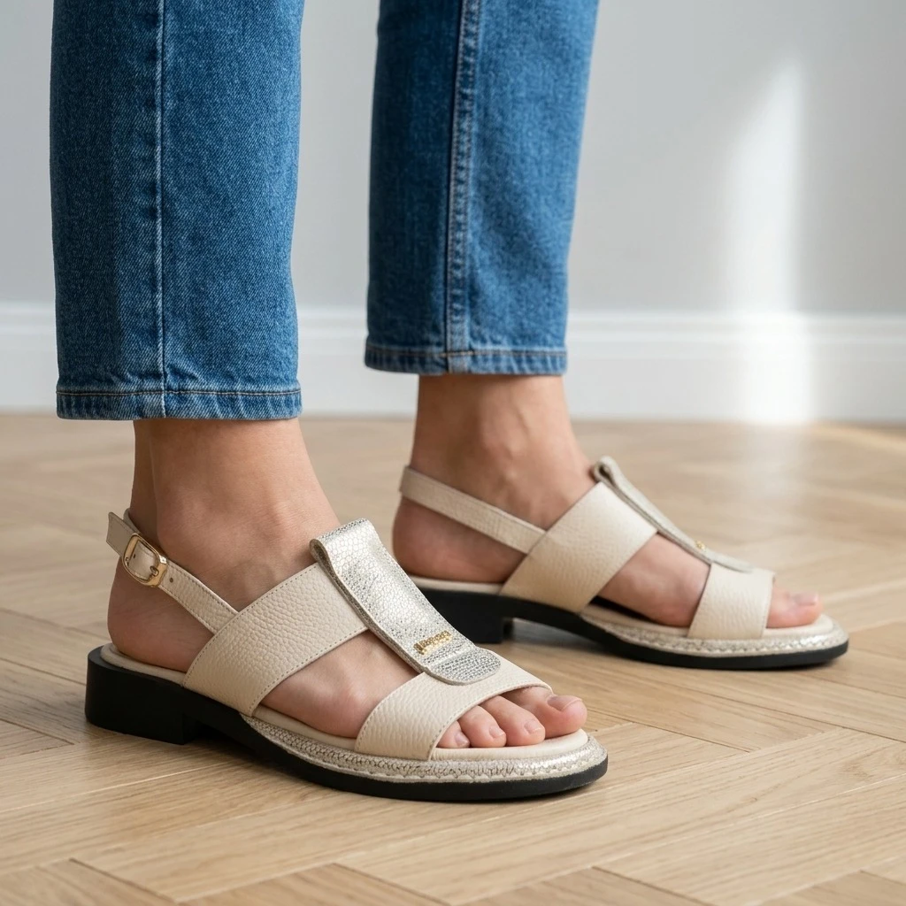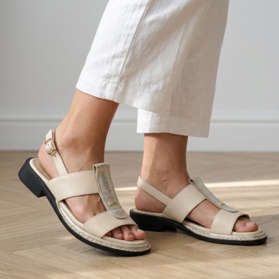 Krem, złoto i delikatny błysk — sandały, które łączą codzienną wygodę z eleganckim charakterem.