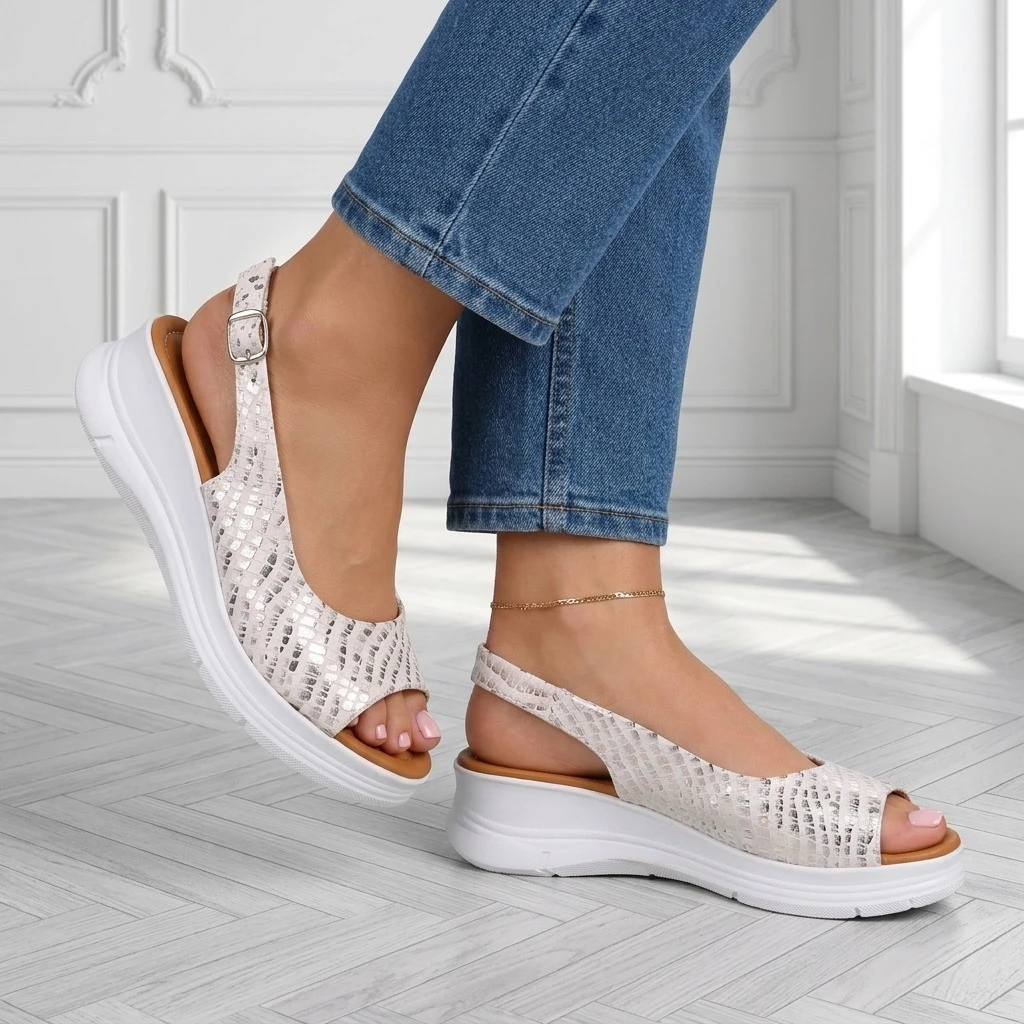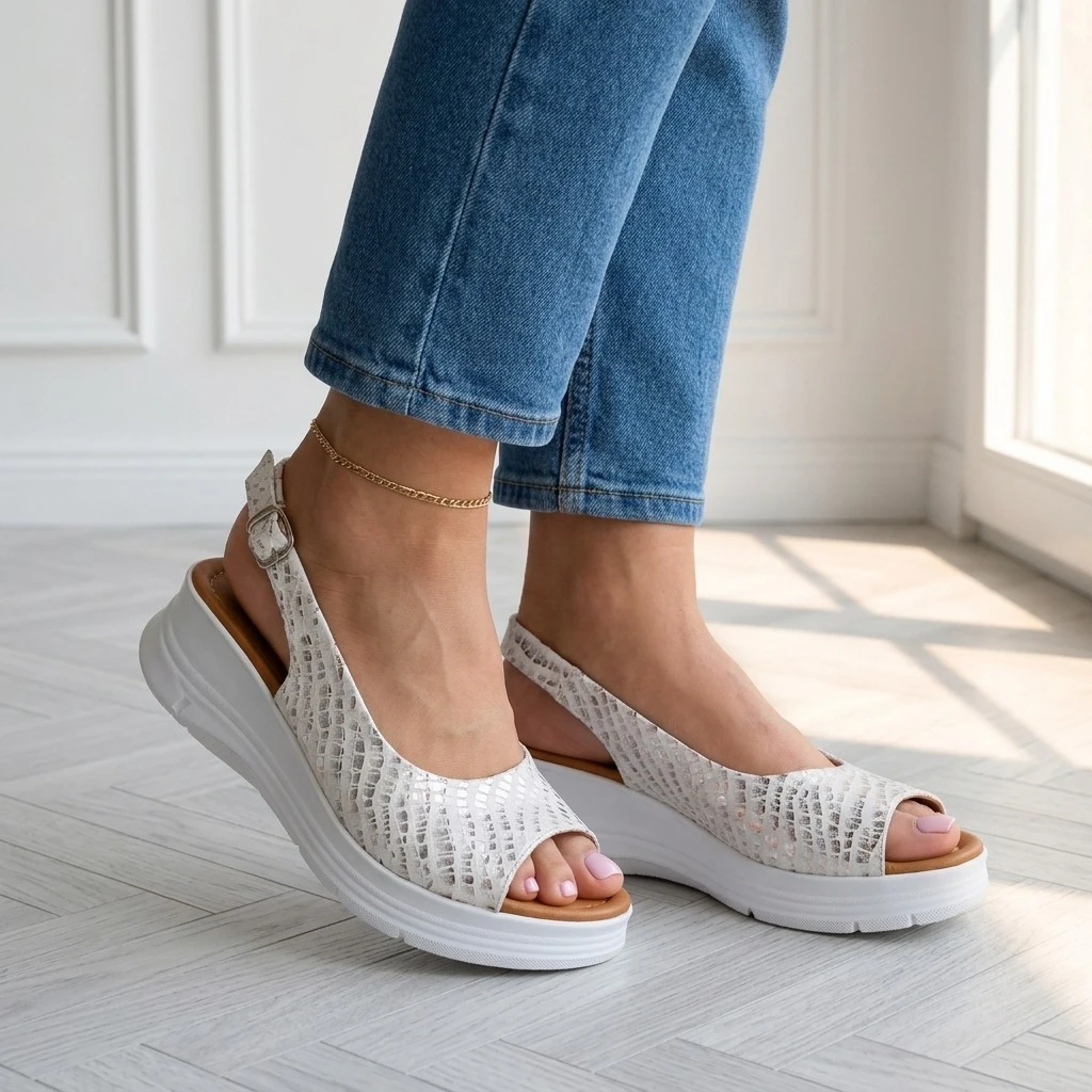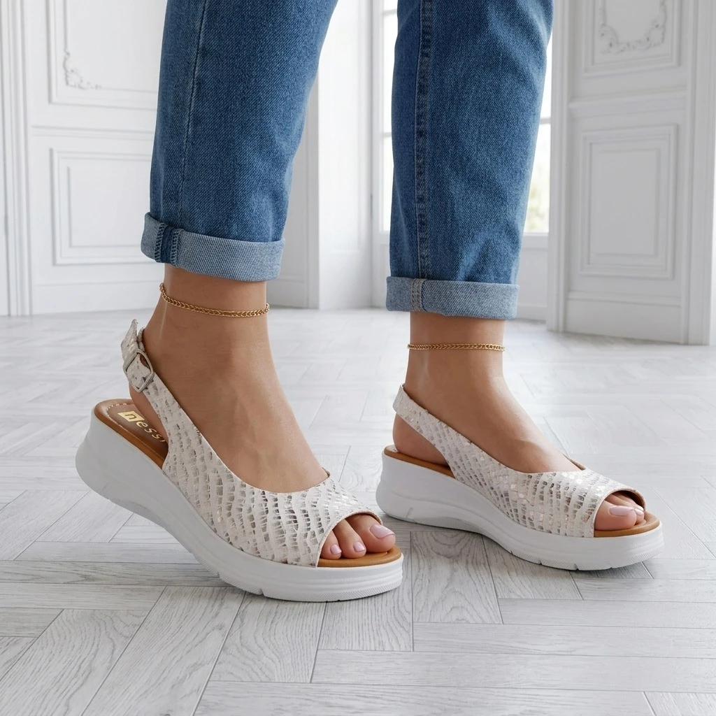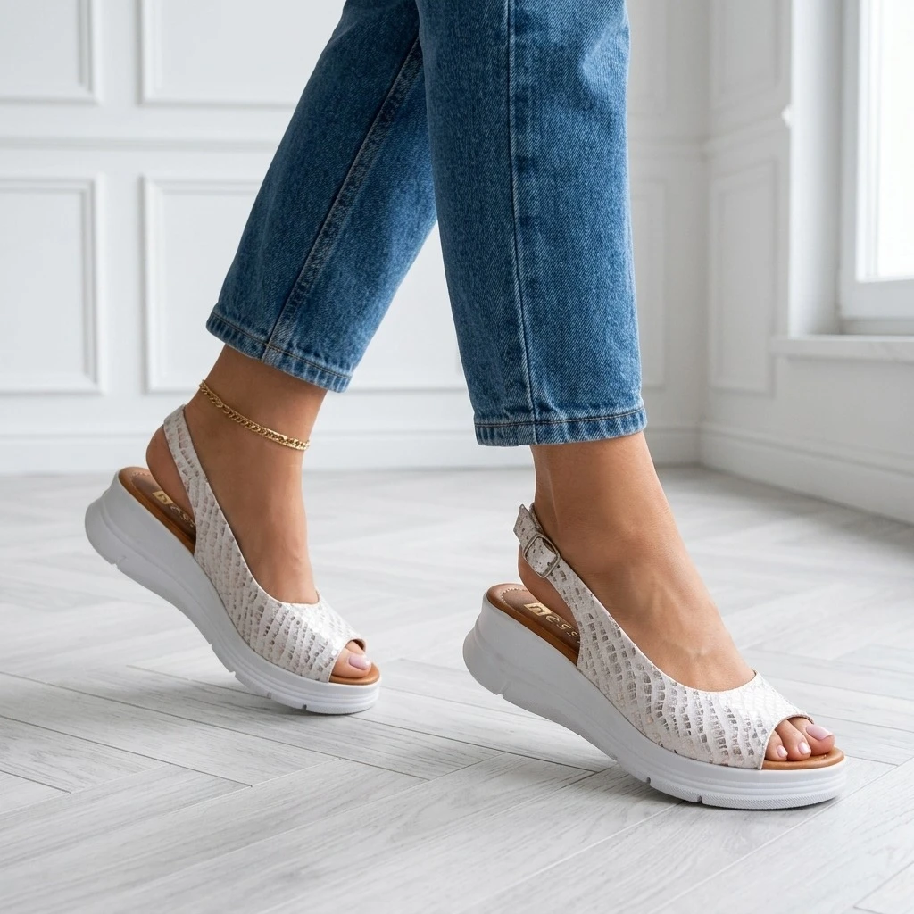 Biało-srebrny koturno — lato na platformie.