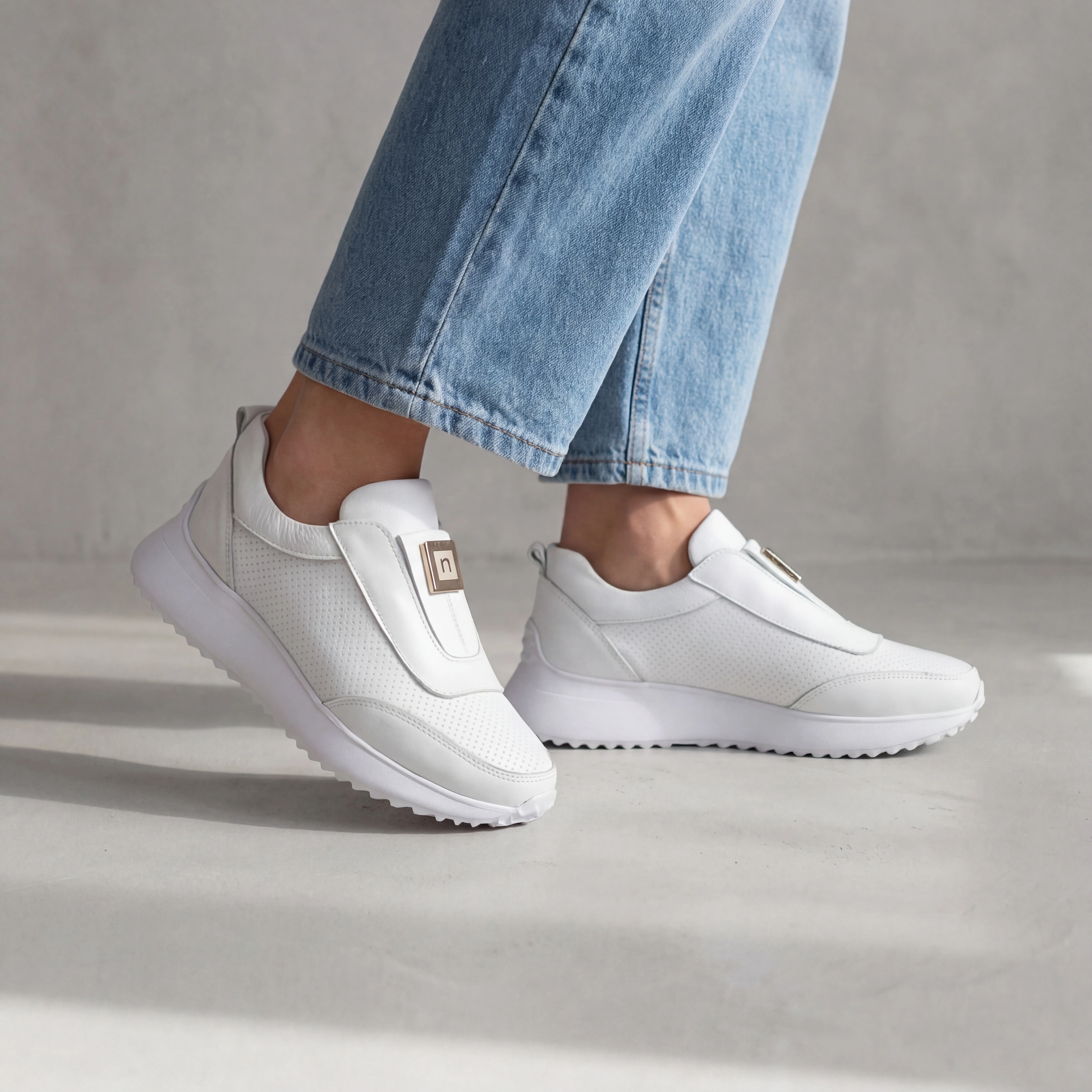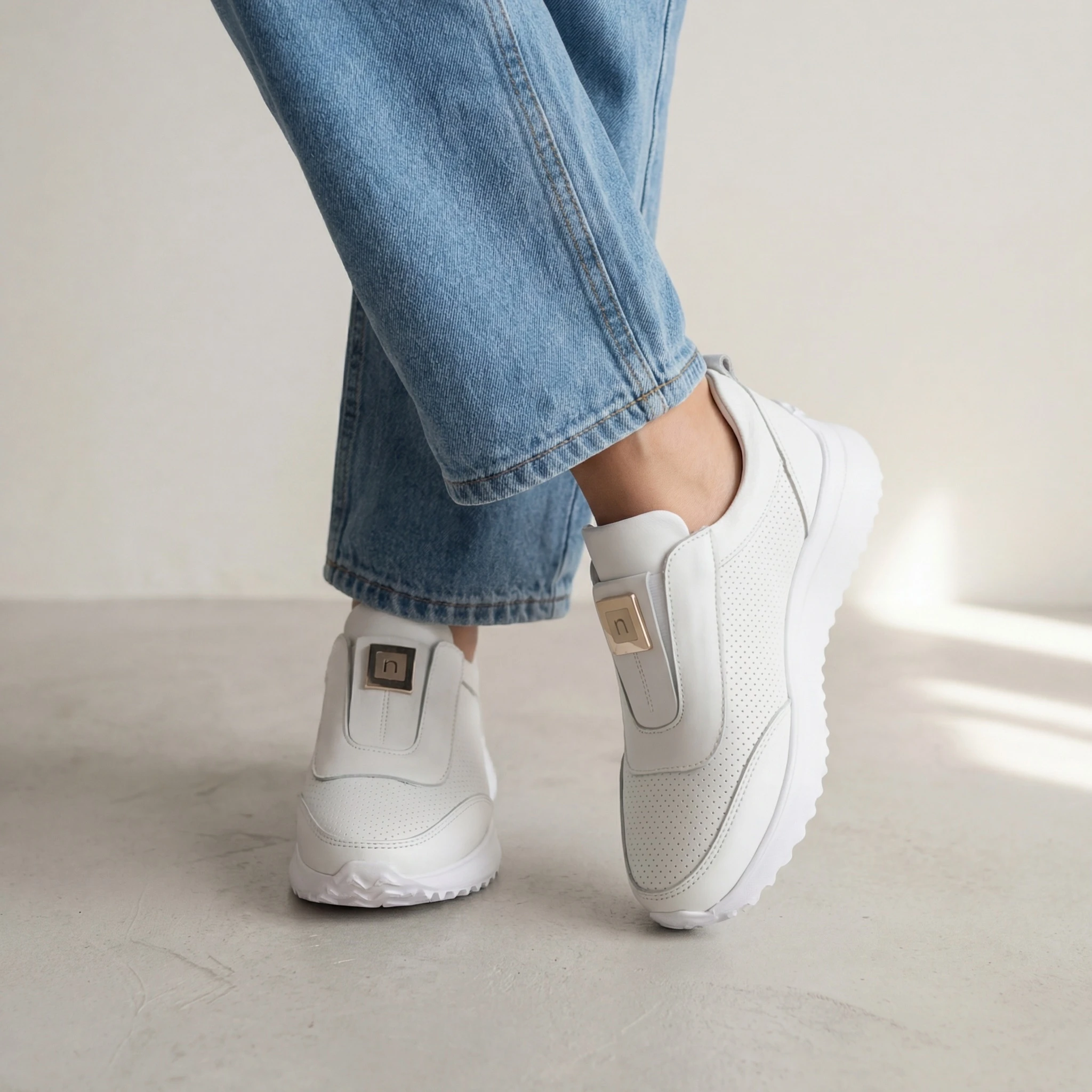 Sneakersy 26LP086 to model slip-on dla kobiet, które cenią wygodę bez rezygnowania ze stylu. Biała perforowana skóra naturalna, platforma i brak sznurówek — wchodzisz, wychodzisz, wyglądasz świetnie. Złoty metalowy logotyp Nessi na boku to subtelny detal, który kończy całość. Pasują do jeansów, lnianej spódnicy i wakacyjnych stylizacji.