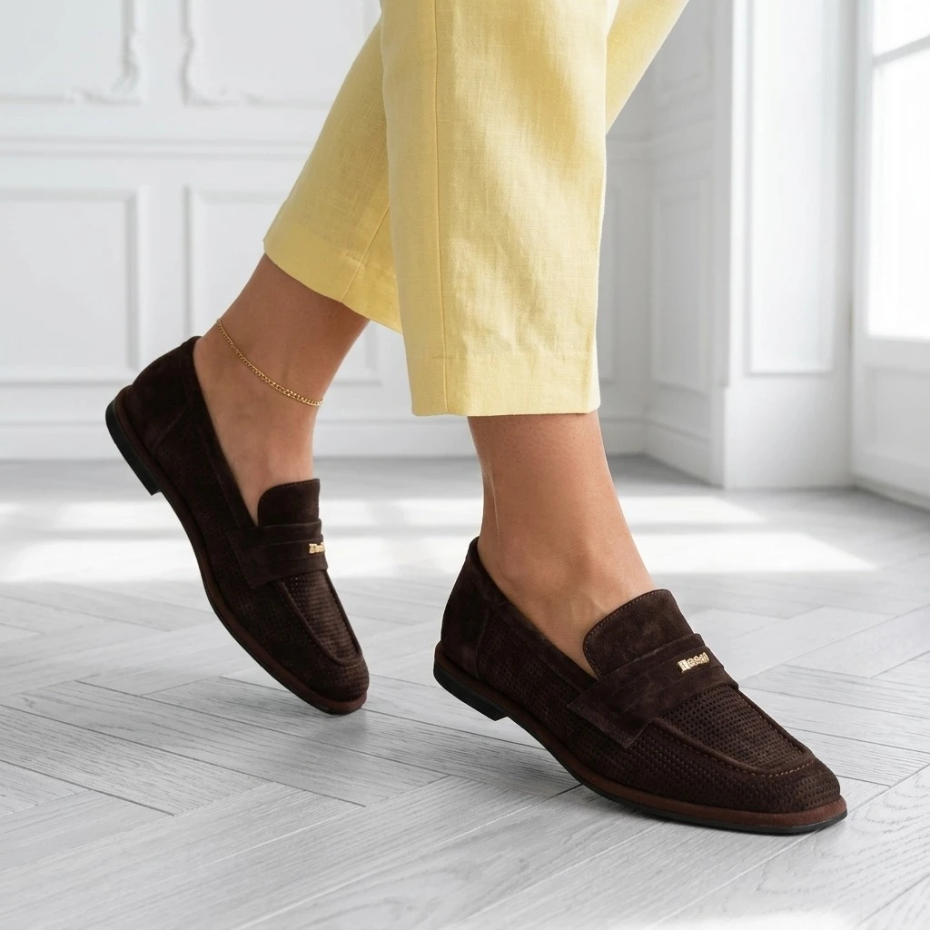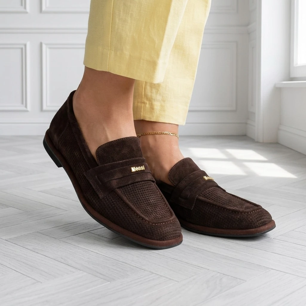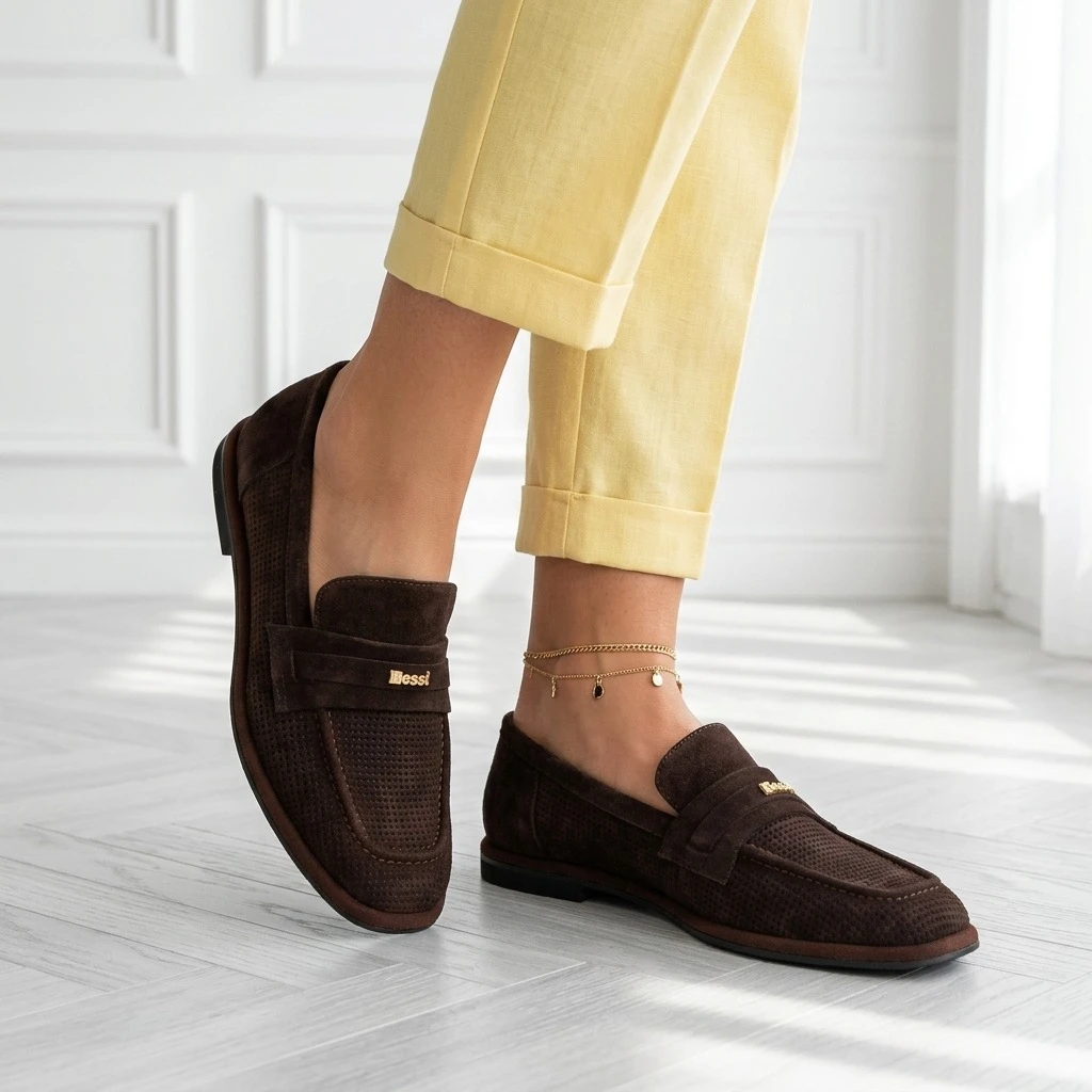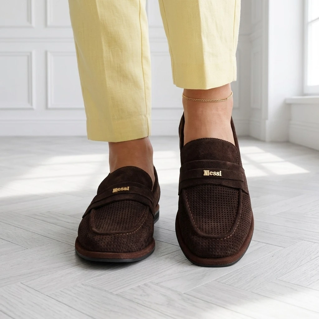Ciemny brąz, zamsz, ażurowy wzór — półbuty, które oddychają.