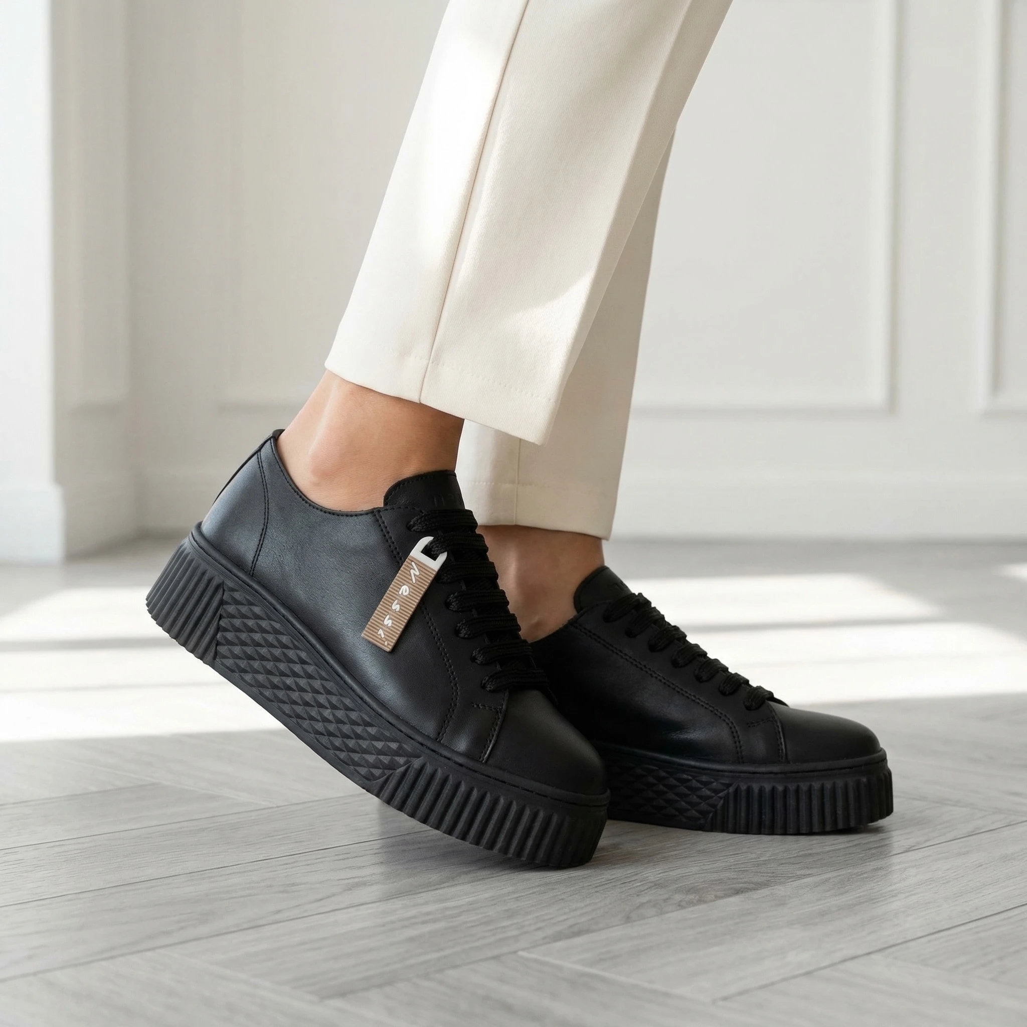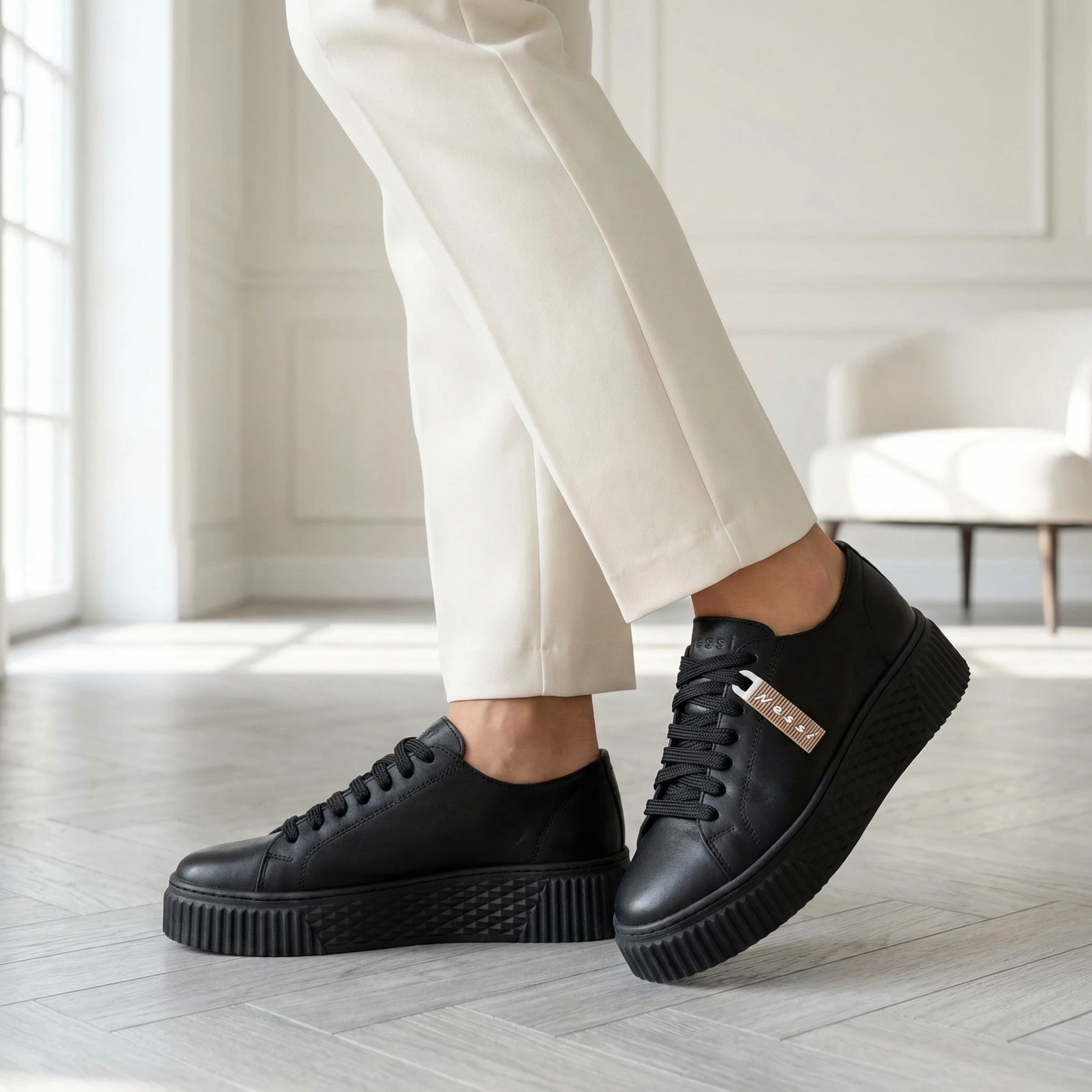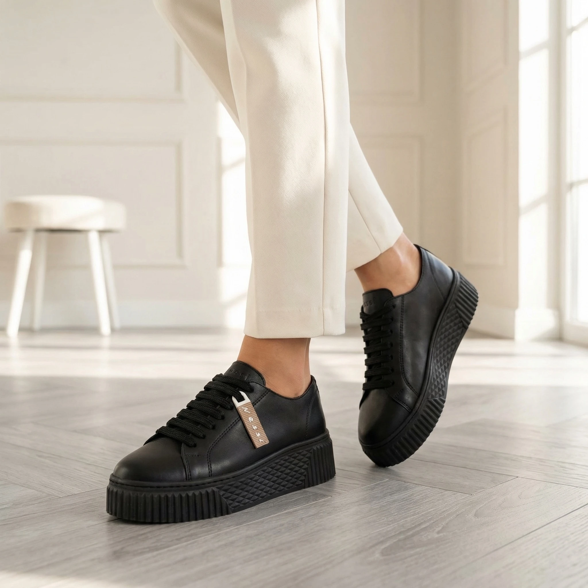 Jednolita, głęboka czerń nadaje całości wyrazistości i sprawia, że model pasuje zarówno do eleganckich, jak i casualowych stylizacji. Platforma podkreśla proporcje sylwetki i dodaje charakteru, zachowując komfort codziennego noszenia.
