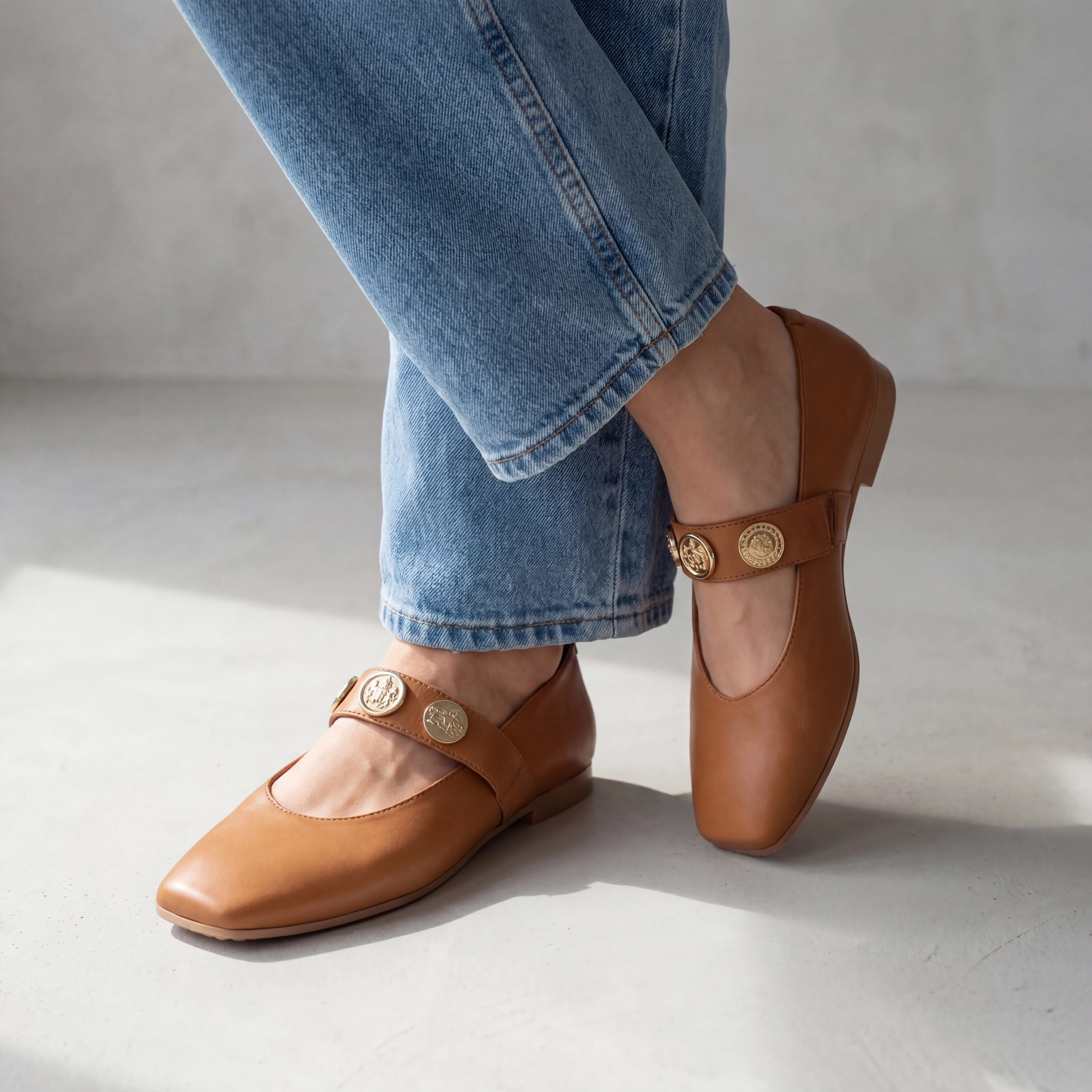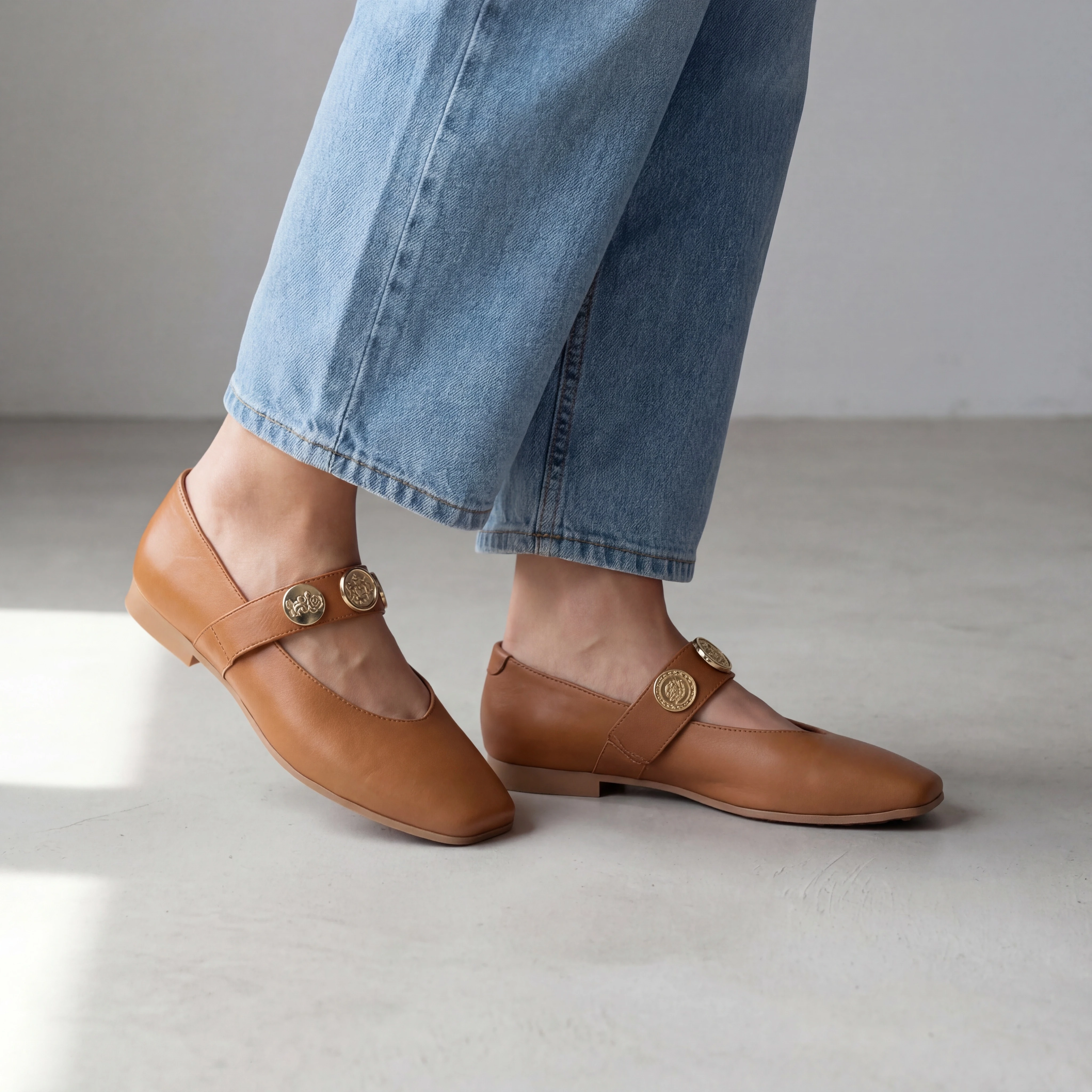 Jeden szczegół zmienia wszystko. Złota klamra na karmelowej skórze — i but, który sam w sobie jest biżuterią.