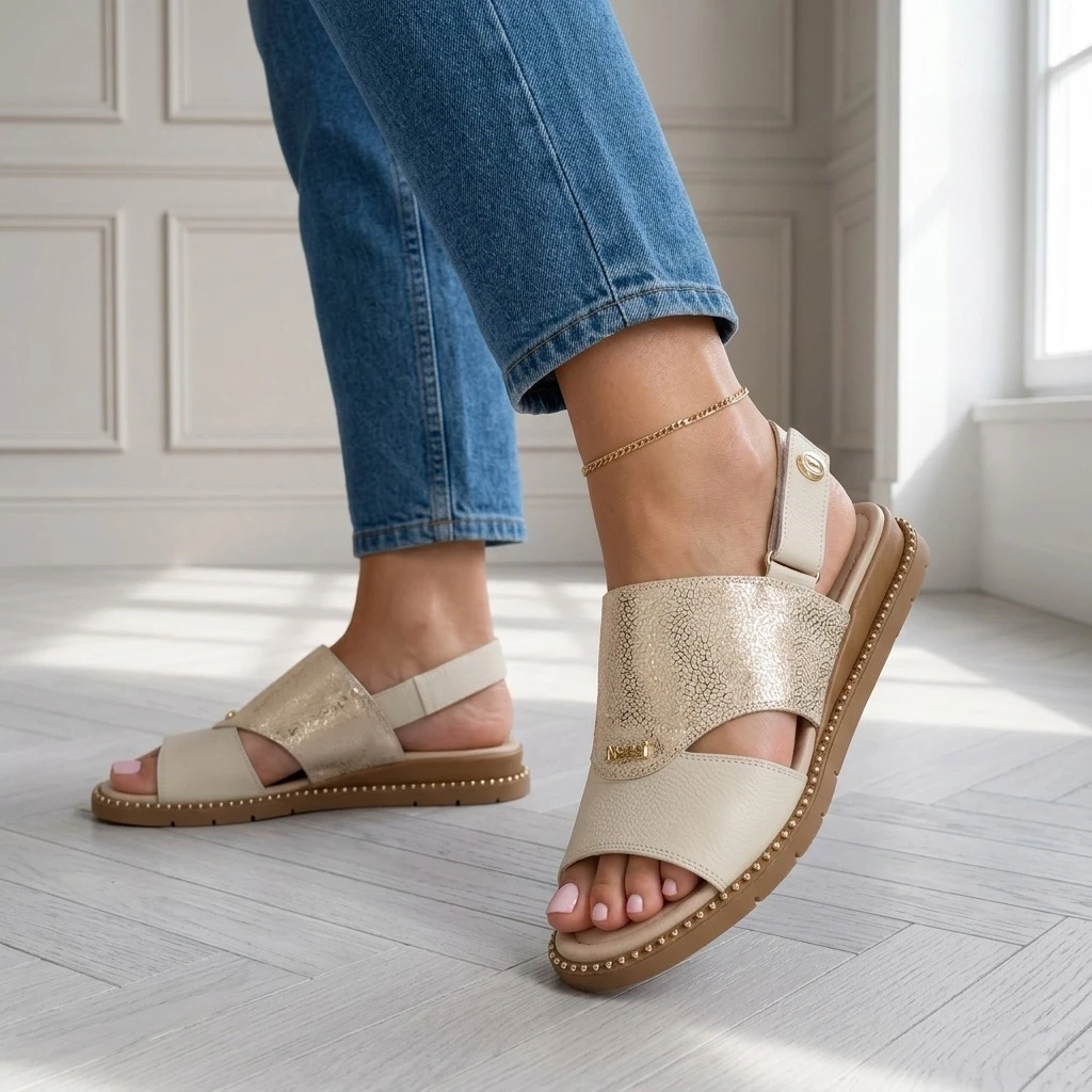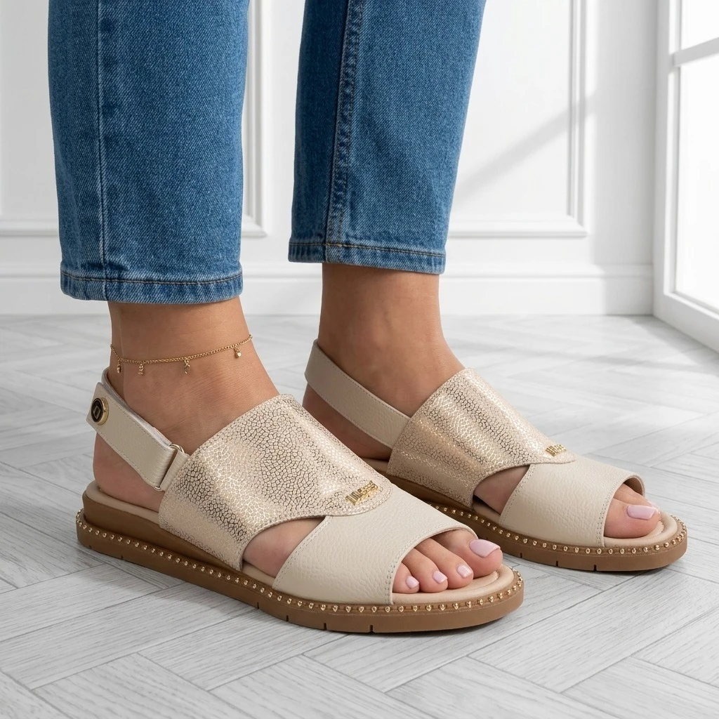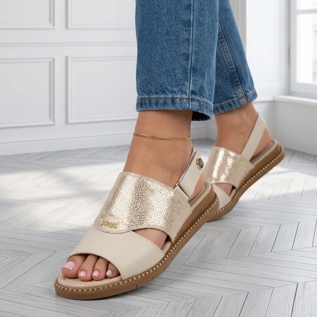 Sandały 26LS102 to Kremowa skóra naturalna z połyskującą złotą wstawką w drobnym wzorze. Stabilna sprzączka, slingback i wygodna podeszwa sprawiają, że są komfortowe od pierwszego założenia. Niski obcas i stabilna podeszwa zapewnia odciążenie stopy przez cały dzień.