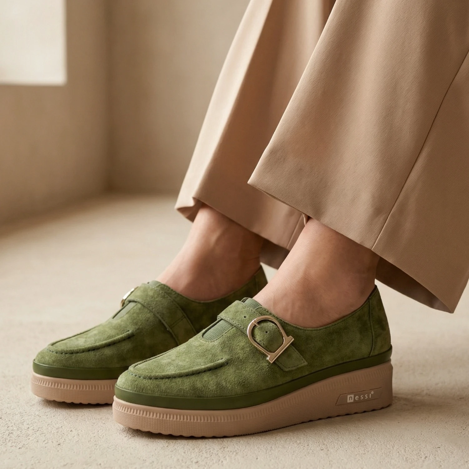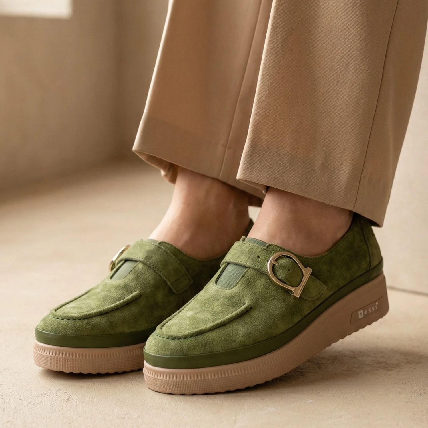 Lekka platforma subtelnie unosi sylwetkę, a miękka konstrukcja zapewnia wygodę podczas codziennego użytkowania. To model, który świetnie wygląda zarówno z szerokimi spodniami, jak i z prostą sukienką czy garniturem.