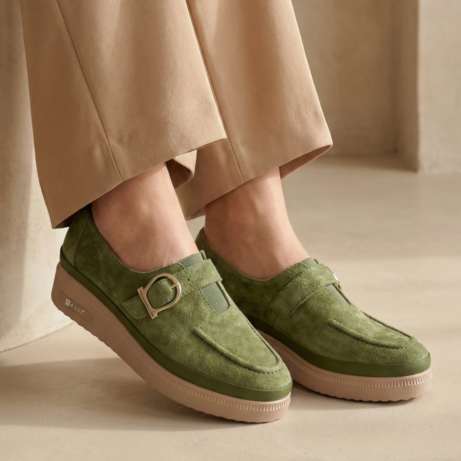 Zamszowe loafersy w głębokim odcieniu zieleni to propozycja dla kobiet, które chcą odejść od klasycznej czerni i beżu. Model przyciąga uwagę minimalistyczną formą oraz dużą, metalową klamrą, która nadaje mu nowoczesny akcent.